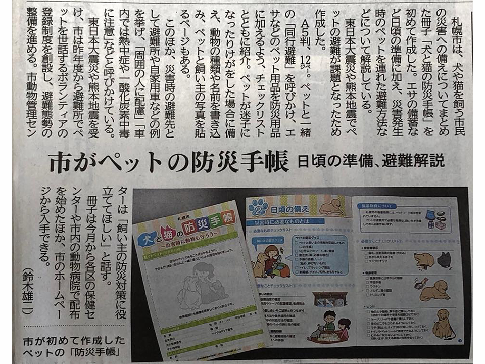 平成30年6月1日、本日の北海道新聞に、札幌市が「犬と猫の防災手帳」の配布をスタートしたことが紹介されました。