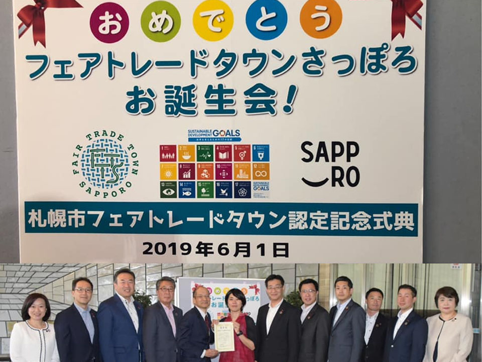 札幌市が日本で5番目のフェアトレードタウンとして認定を受け、札幌市役所1Fロビーで「おめでとうフェアトレードタウンさっぽろお誕生会!札幌市フェアトレードタウン認定記念式典」が行われました。