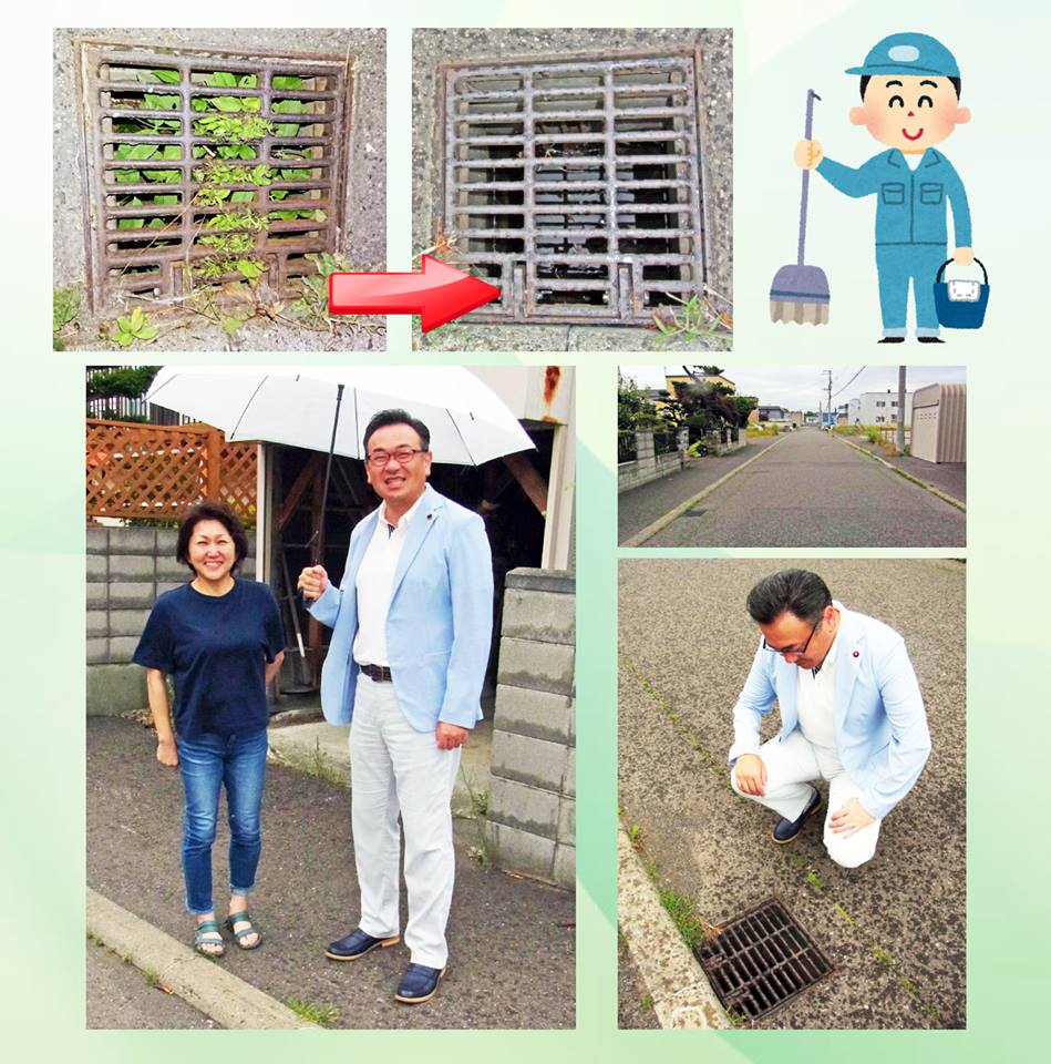 「北都町内会」の住民の皆さんから「市道の雨水ますのつまりが酷いので、大雨が降る前に清掃を」とのお話を頂いておりましたが、先日問題地域の雨水ますの一斉清掃を行いました。 先ほど現地を確認に伺ったところ、ご相談者も大変に喜ばれておられました。